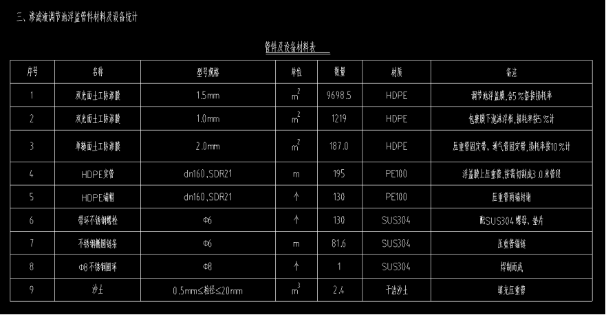 垃圾填調節池用于儲存垃圾填埋場(chǎng)內富余滲瀝液,排除填埋區內積水、保證滲瀝液的安全儲存,防止外漏帶來(lái)的環(huán)境污染。設計采用主體為“1.5mm厚HDPE土工防滲膜+鈉基膨潤土防水毯 GCL+壓實(shí)黏土層”的防滲結構,自上而下依次為:懸浮蓋膜(1.5mm厚光面HDPE防滲膜)、防滲底膜(1.5mm厚單糙面HDPE防滲膜) 三維士工復合排水網(wǎng) (7mm厚)、防滲底膜(1.5mm厚單糙面HDPE防滲土工膜)、鈉基膨潤土防水毯 (4800g/m 2)、場(chǎng)地基礎粘土層。